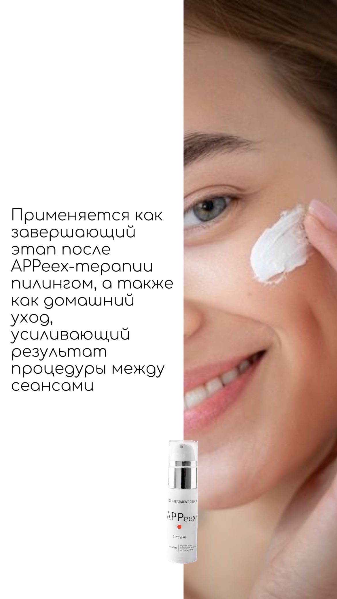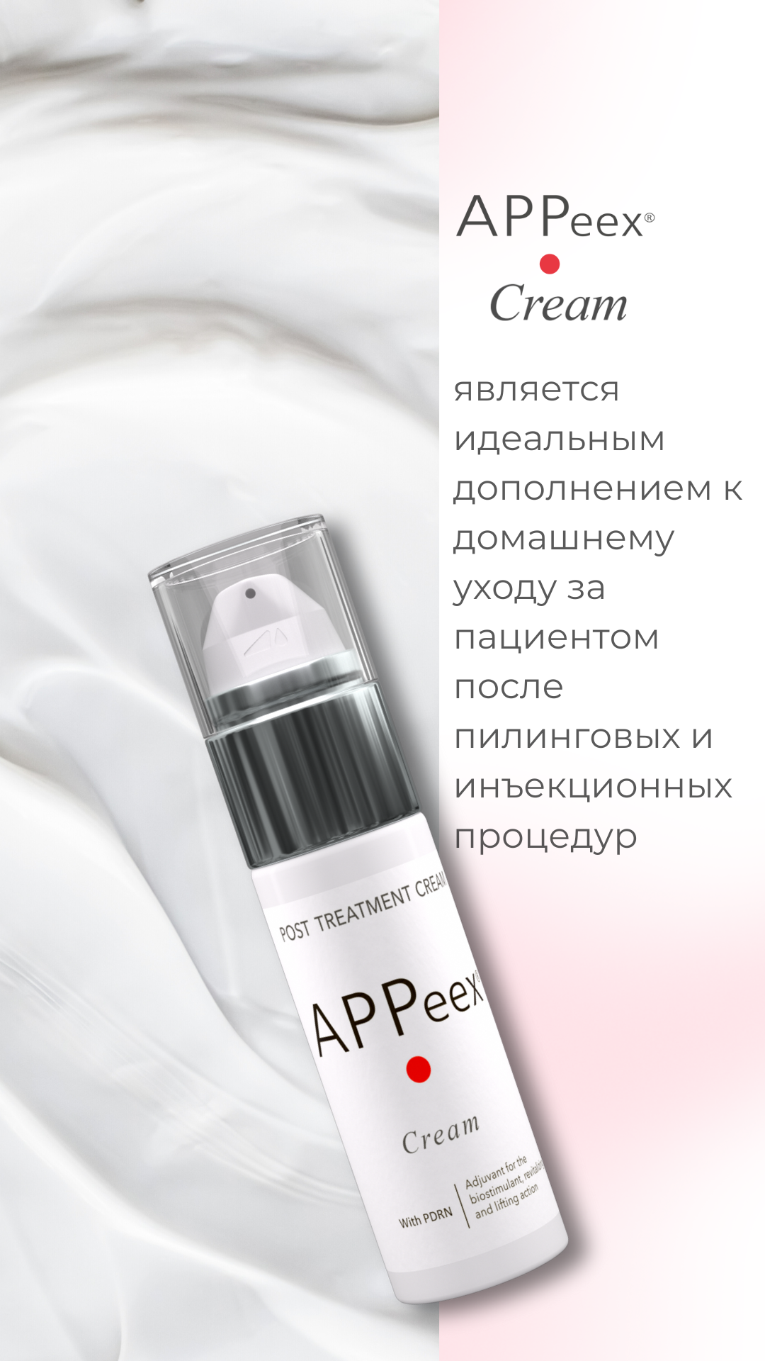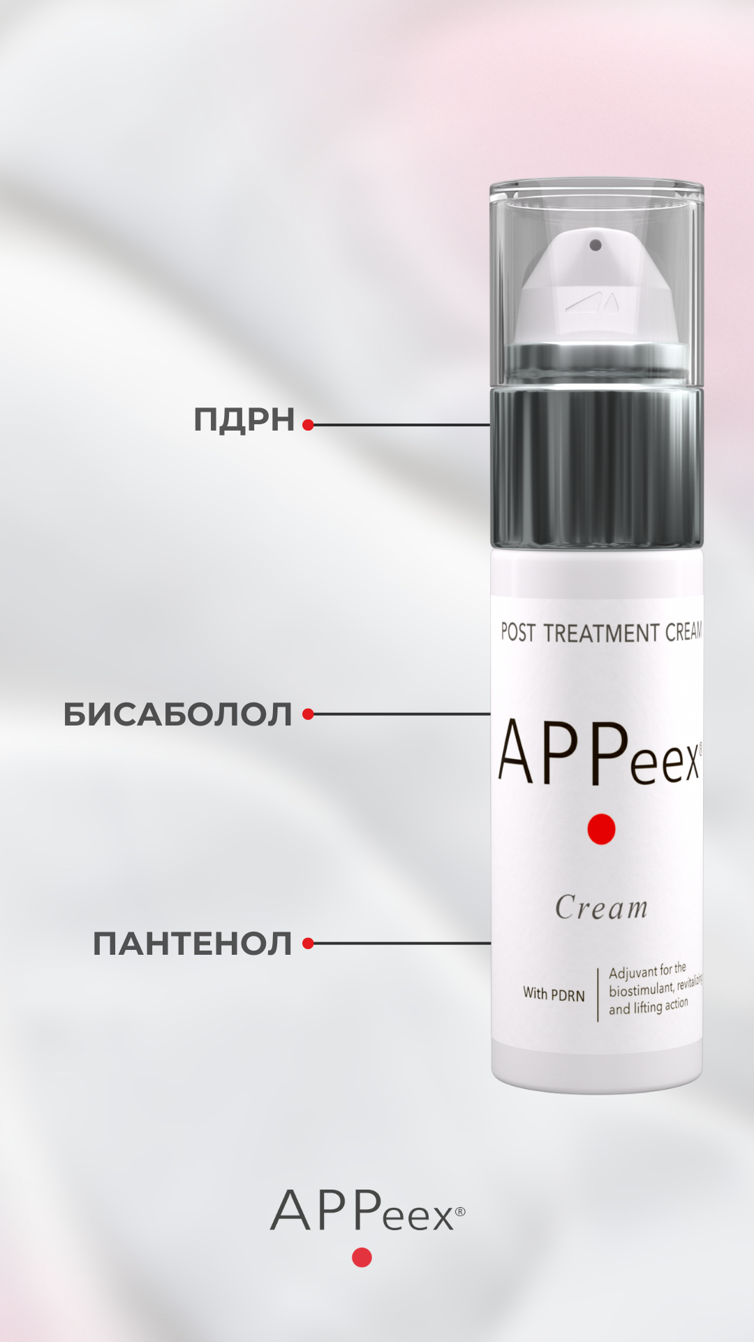 APPeex cream – постпилинговый крем, содержащий в своем составе полидезоксирибонуклеотиды (PDRN) и увлажняющие компоненты. За счет мягкой текстуры и мощных энханцеров - степень пенетрации составляет 97%. Применяется как завершающий этап после APPeex-терапии пилингом, а также как домашний уход, усиливающий результат процедуры между сеансами. Регенерирующие свойства крема позволяют использовать его не только после пилинга APPeex, но и после любых травмирующих процедур. APPeex cream предотвращает процессы старения, уменьшает морщины, восстанавливает эластичность и упругость кожи, стимулирует восстановление ДНК, помогает снять раздражение чувствительной кожи. За счет PDRN крем APPeex обладает регенеративным, противовоспалительным и осветляющим эффектом.