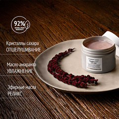 Маслянистая массажная текстура идеально сочетается с отшелушивающим действием кристаллов сахара. После ополаскивания кожа становится шелковистой, обновленной и гладкой. Амарантовое масло в составе восстанавливает защитный барьер кожи, питая и увлажняя ее.