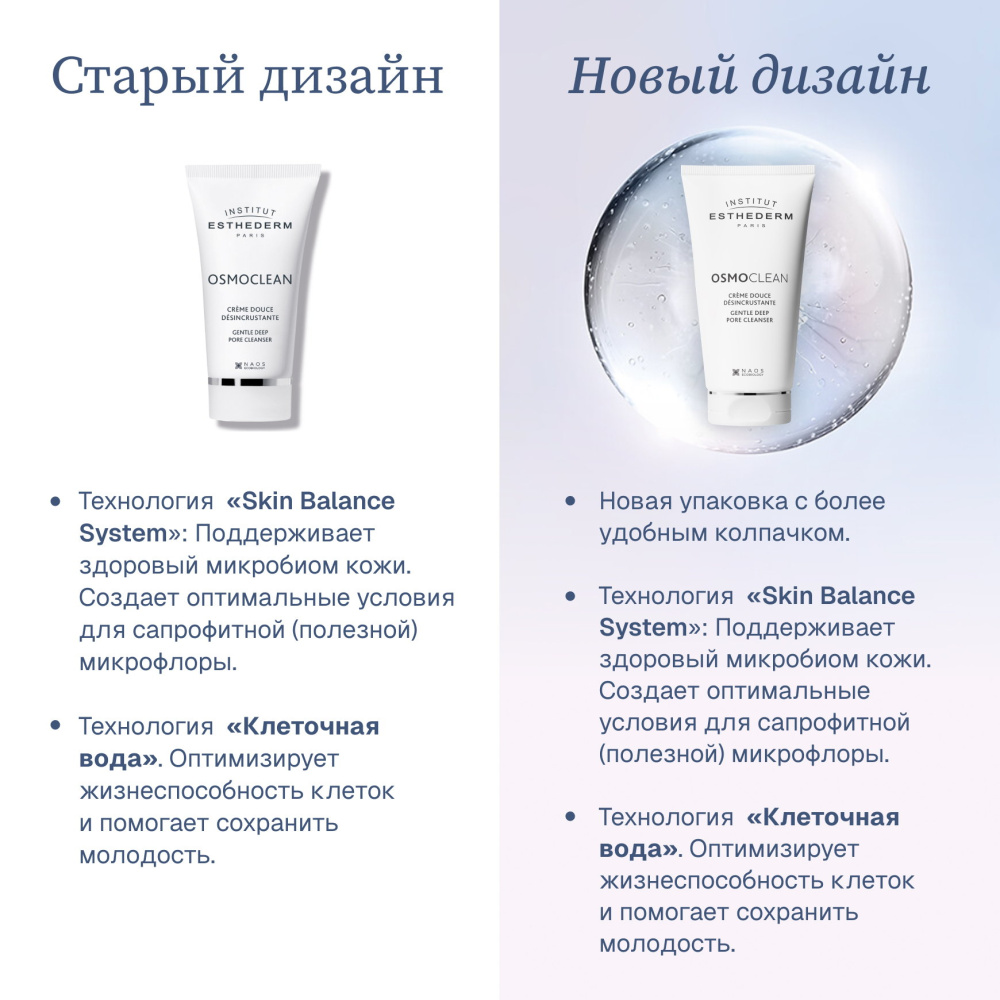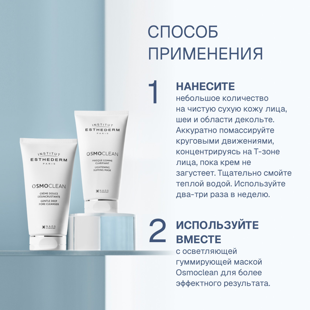 Очищающий крем-дезинкрустант OSMOCLEAN - это средство для ухода на основе запатентованной клеточной воды и принципе осмоса, вдохновленное профессиональными методиками Institut Esthederm, чтобы кожа выглядела молодо с первого шага вашей косметической рутины. Мягкий крем дезинкрустант очищает кожу, не повреждая экосистему на ее поверхности. Благодаря массажу, загрязнения, которые вызывают неровный цвет лица, абсорбируются средством, а коже обеспечивается невероятное ощущение свежести и мягкости. Средство обладает высокой переносимостью.