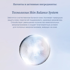 Skin balance system. Экстракт болдо, фруктоолигосахариды. Заботится о естественном балансе кожи. Усиливает природную защиту кожи, помогая ей поддерживать здоровую микрофлору. Способствует уменьшению количества нежелательных микроорганизмов и создает благоприятные условия для полезных микроорганизмов, живущих на коже.